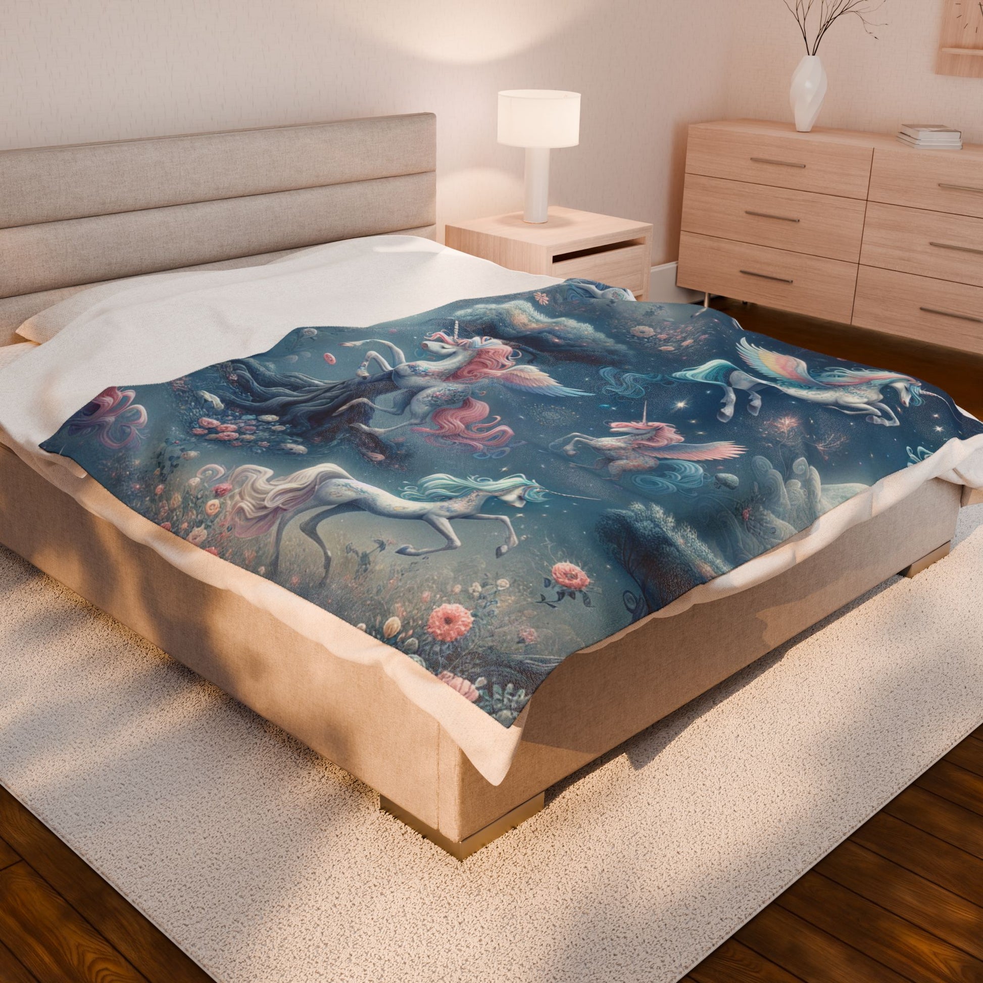 Velvet Blanket, Girls Unicorn Plush Throw, Soft Kids Bedding, Cozy Bedroom Decor, Magical Rainbow Print Bedspread, Nursery Room Accent