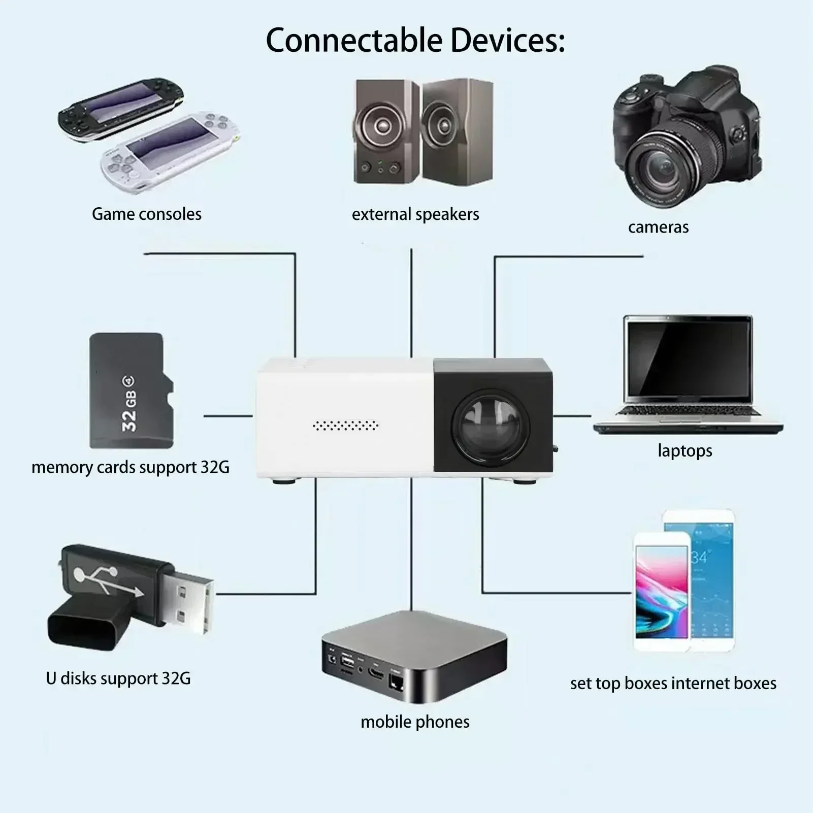 Built in Speakers: The mini projector has built in premium speakers, bringing you a comfortable and intimate sound experience.
